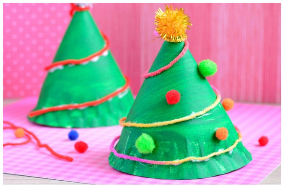 Paper plates, a little paint, yarn, and pom poms make pretty little Christmas trees perfect for use in a centerpiece. Since each plate makes two Christmas trees, this is a fun and frugal craft.
